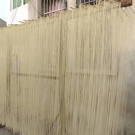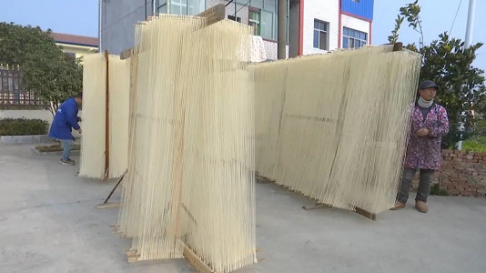 在方安集村大陈湾,农户门口摆满了上了竹筷的油面,面条根根分明,如银丝瀑布悬挂。油面师傅熟练地握住下端竹筷两头,一㨪一拉,面条逐渐拉长,直至下端竹筷能插入面架底部孔眼固定为止。