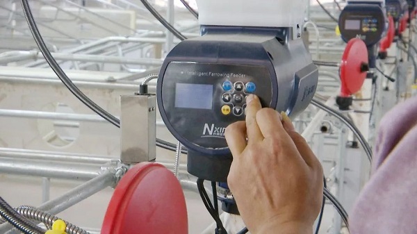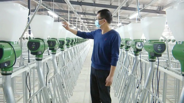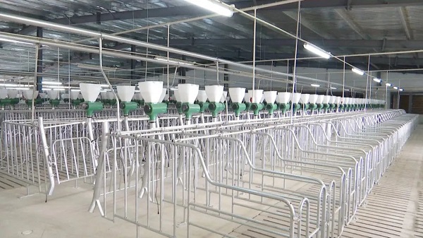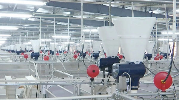 车间内部宽敞明亮,一排排养殖栏位整齐排列,每一栏均配备了智能化喂水投料设备,科技范十足。