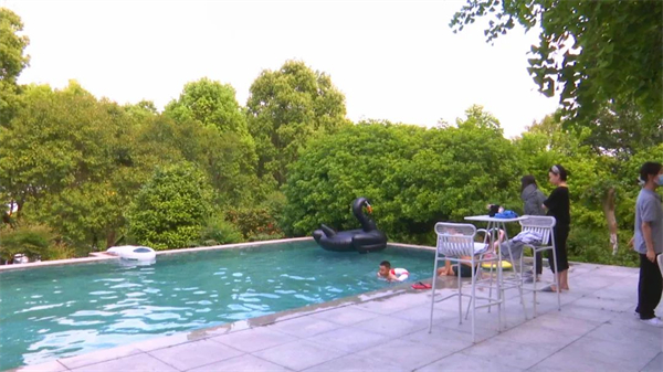 木兰湖畔的斜阳耒筑民宿区,有不少家长和孩子一起在泳池里嬉戏。