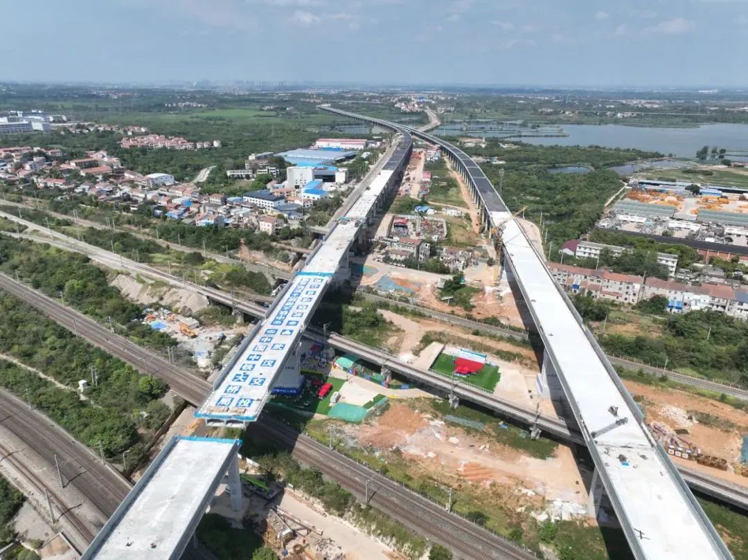 由于该项目需要跨越京广铁路上下行客运线及货运线、武汉北编组站、新港上行线等9条既有铁路营业线。因此,此处的施工只能采用变截面梁转体施工工艺,即先平行于铁路进行梁体施工,再进行转体施工完成桥梁合龙,可以避免地面施工对线路运营造成影响。