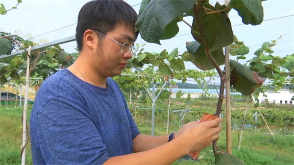 在双河村的一侧的山坡上,猕猴桃基地里的枝叶郁郁葱葱,蓬勃生长。猕猴桃刚刚进入试挂果期,工作人员用棕色纸袋包扎好,静待成熟。