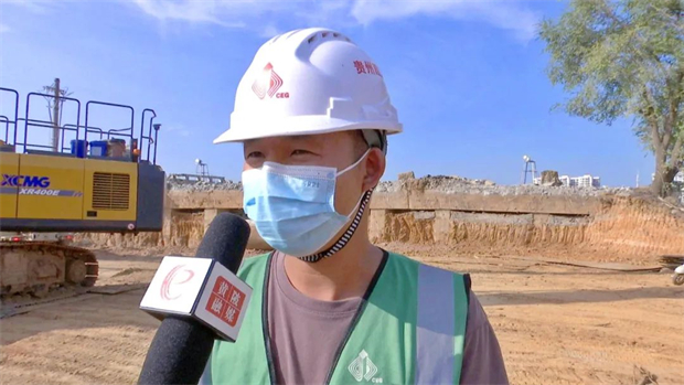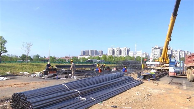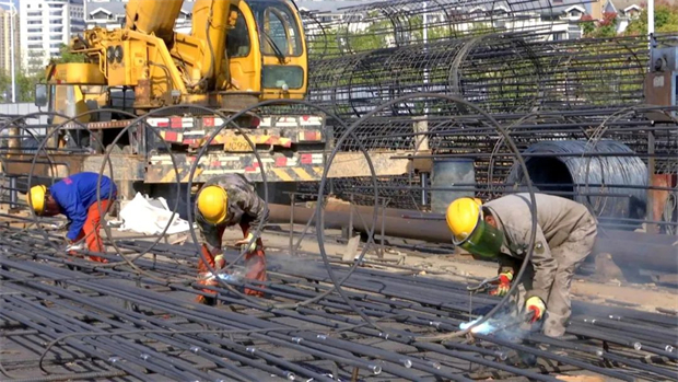 节日期间,程家墩互通改造工程施工现场一片热火朝天,工人们正在抓紧进行土方清理,测量、勘探桩基,焊接钢筋,为后续浇筑做准备。
