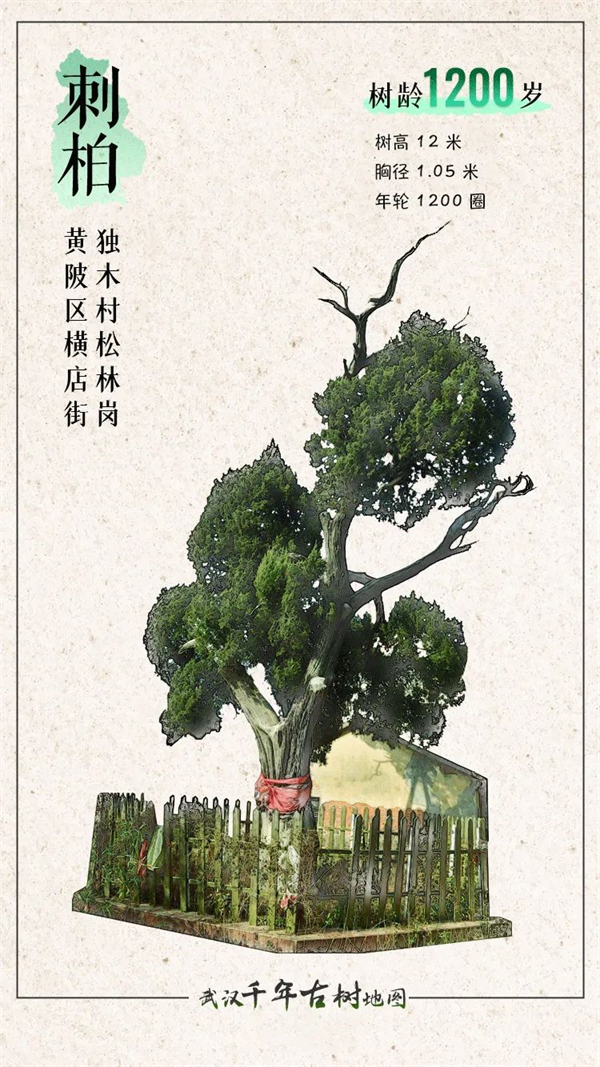 穿过千年岁月,历经沧桑巨变,黄陂区横店街独木村有棵树龄约1200年的刺柏,屹立千年仍枝繁叶茂。