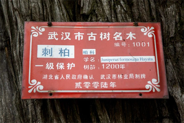 据研究人员考证,这棵刺柏生于晚唐,历经风霜,穿越千年,树高12米,胸径1.05米,年轮1200圈,比武汉中心城区最老的古树还长300岁,因此也被称为武汉市最长寿古树。