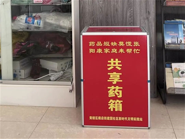 12月8日,“共享药箱”正式设立,药箱上面写着显眼的几个字——“药品短缺莫慌张,阳康家庭来帮忙”。