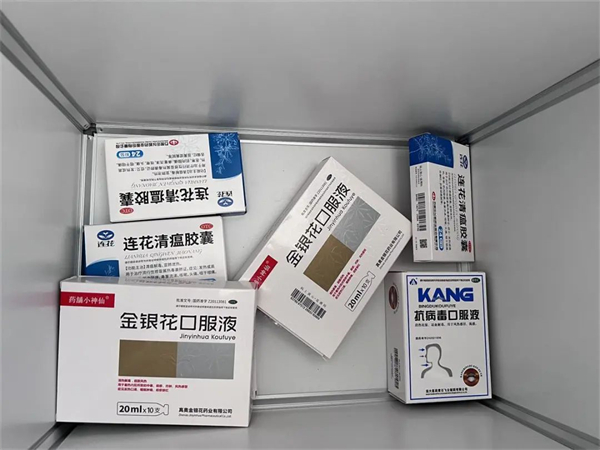 记者在药箱里看到,内有近十盒连花清瘟、金银花口服液、抗病毒口服液等紧缺药品。