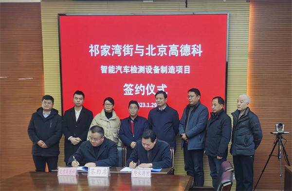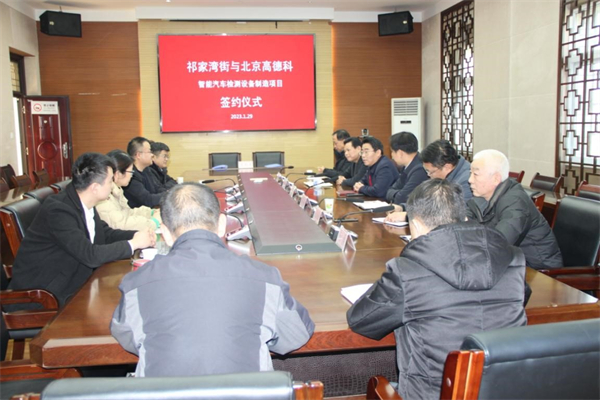 1月29日(正月初八)上午,总投资5亿元的北京高德科科技有限公司智能汽车检测设备制造项目正式签约落户祁家湾街。黄陂区商务局副局长李刚、祁家湾街道党工委书记张永安出席活动,街道办事处主任汤全胜与北京高德科科技有限公司(以下简称高德科公司)负责人李志高正式签署项目合作协议。
