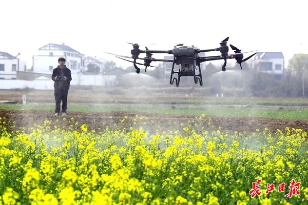黄陂永旺智慧农场,一架植保无人机在一片油菜花田喷洒除草剂。