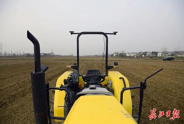 黄陂永旺智慧农场,“无人”旋耕机在田间按设定航线耕作。