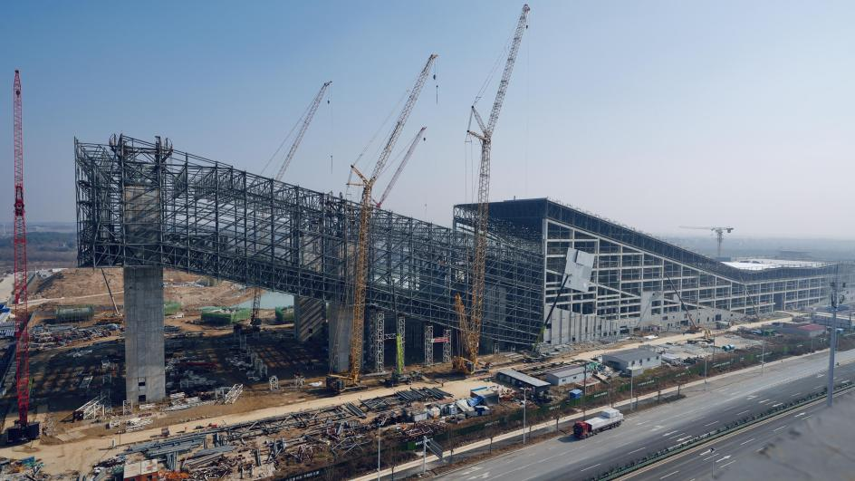 在甘露山文创城雪世界钢结构项目建设现场,两台巨大的起重机正在作业,长长的起重臂向上延伸。现场施工负责人介绍,高区钢结构包括转换层钢结构、格构柱及柱间支撑、屋盖钢结构三个部分,此次是甘露山文创城雪世界钢结构项目进行整体提升,由于总重量达到9200多吨,所以每小时大约只能提升约2米高。