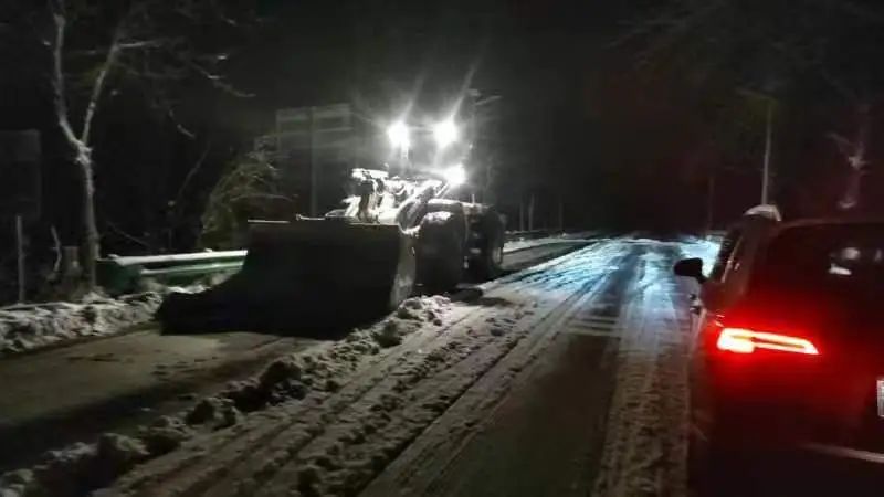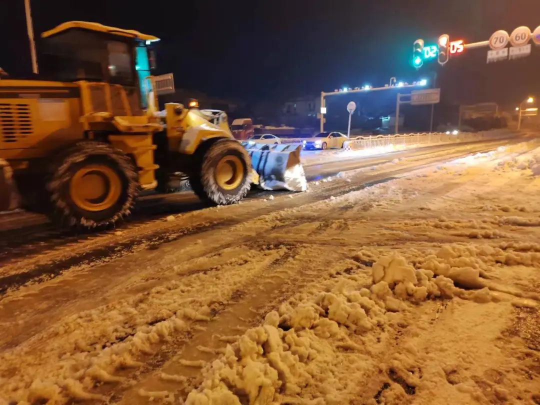 天河街晚上组织机械继续对道路铲雪,对重点路段撒盐融冰,保障车辆通行安全