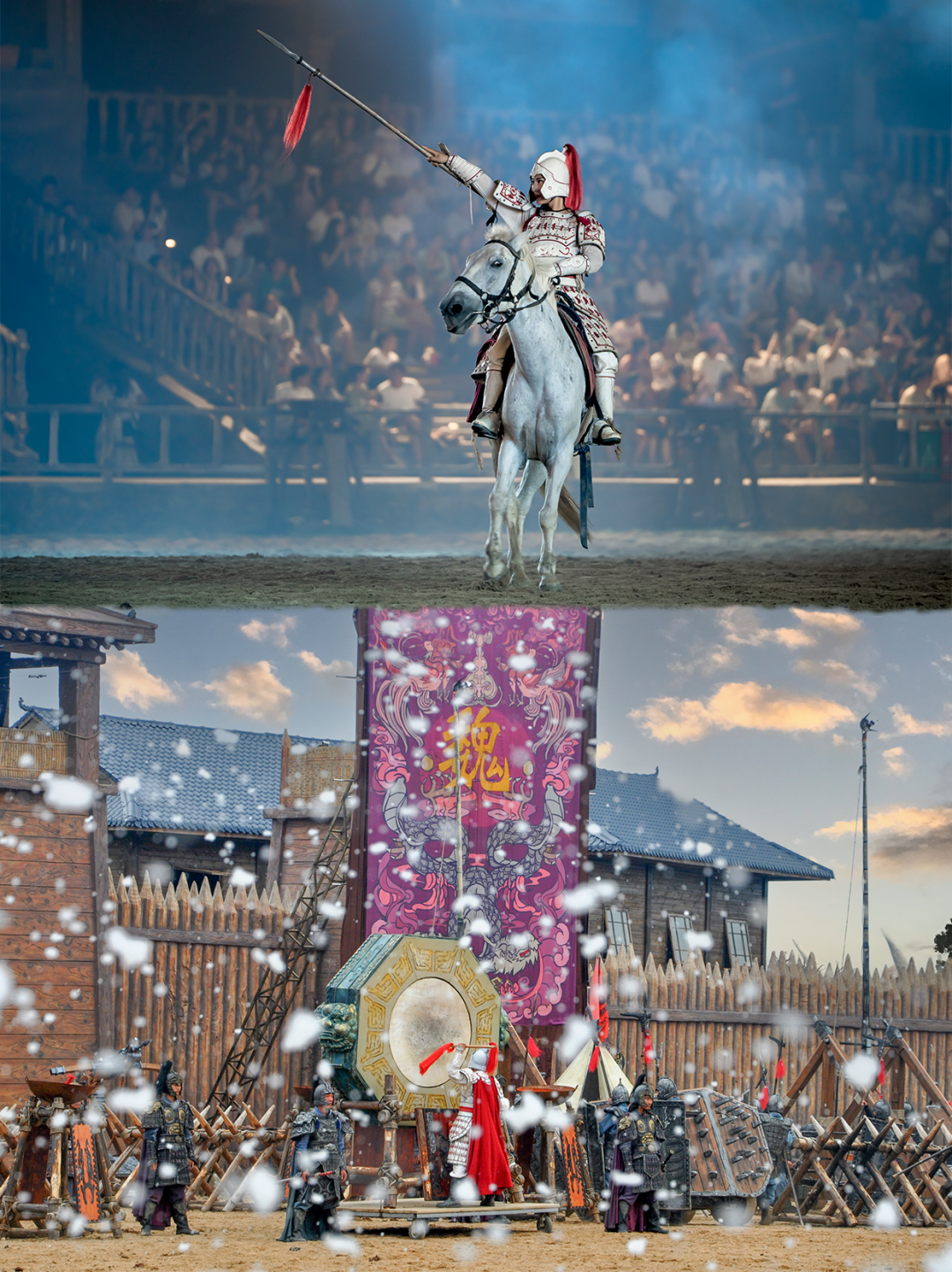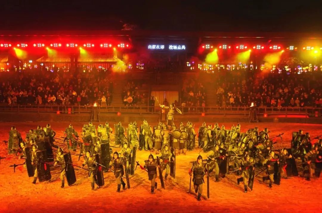 在木兰景区,最受欢迎的大型实景演出《花木兰·云中战歌》正在“云中镇”剧场上演。夜色中,花木兰身披战甲,纵马而来。在声光电特效、舞美以及烟火的巧妙配合下,花木兰代父从军,征战沙场的传奇故事一一再现,整场演出大气磅礴。