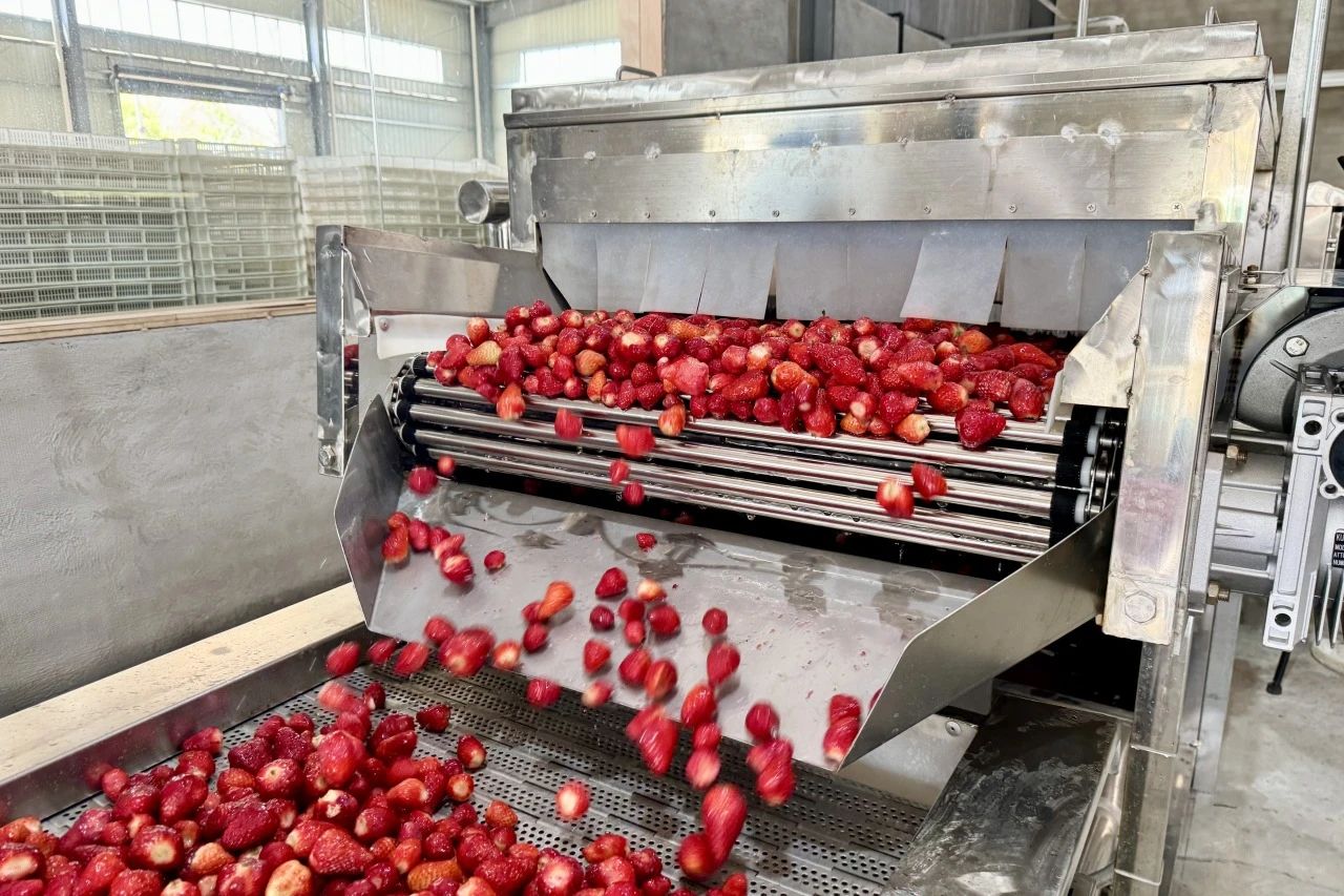 走进木兰红草莓加工厂,一幅忙碌有序的生产景象映入眼帘。在分拣车间,40多名工人手法娴熟地给草莓削蒂分级;在初加工车间,草莓经专业清洗流水线洗净后被整齐摆放,随即送入冷库冰冻。