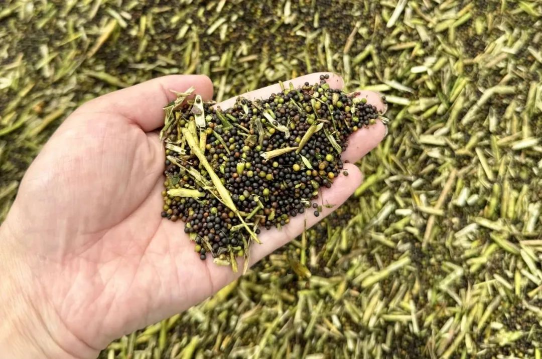 记者近日走进位于罗汉寺街伏南村的志同稻合农机专业合作社,只见600亩油菜基地里,饱满的油菜荚低垂枝头,农机手驾驶收割机在田间来回穿梭,在机器的轰鸣声中,油菜被迅速卷入,自动完成脱粒,油菜果壳和秸秆被碾成碎片也随即还田,化作天然肥料滋养土地,实现资源循环利用。收割后的油菜籽则被运往合作社工厂,在阳光下均匀铺洒晾晒,等待榨取金黄菜油。