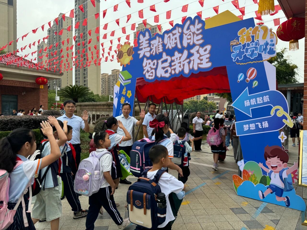 校门口装饰五彩拱门喜迎学子