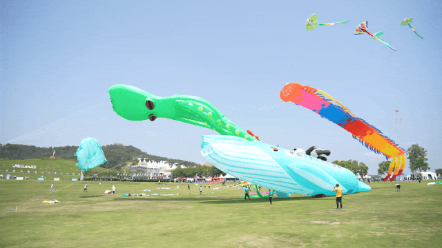 随着赛事启幕,天空化作缤纷舞台,造型各异的风筝翩跹共舞。憨态可掬的“鳄鱼”、经典活泼的“葫芦娃”、灵动逼真的“章鱼”等大型软体风筝翱翔天际,吸引观众纷纷仰首驻足。运动风筝团队则以精准操控呈现连串表演,在空中勾勒出“爱心”“回字”等流畅造型,尽显力与美的交融。