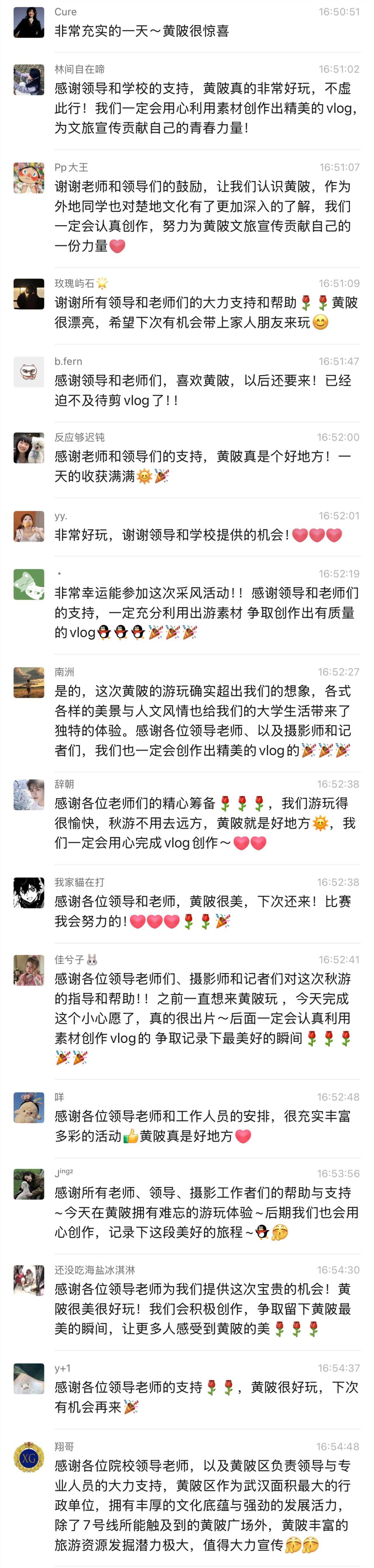 在采风过程中,青春创意与在地文化实现了深度对话。通过实地探访黄陂代表性景区,学子们亲身感受黄陂秋日风光与人文魅力,为VLOG创作积累鲜活素材;活动中融入的创作指导与互动交流,精准助力学生提升视频制作与叙事能力;深度的木兰文化体验,增强了青年群体对地方传统文化的理解与传播意愿;宝贵的实战机会,则实现理论与实践的有效结合。学子们纷纷回应被大美黄陂“圈粉”,获益良多。