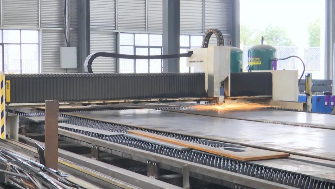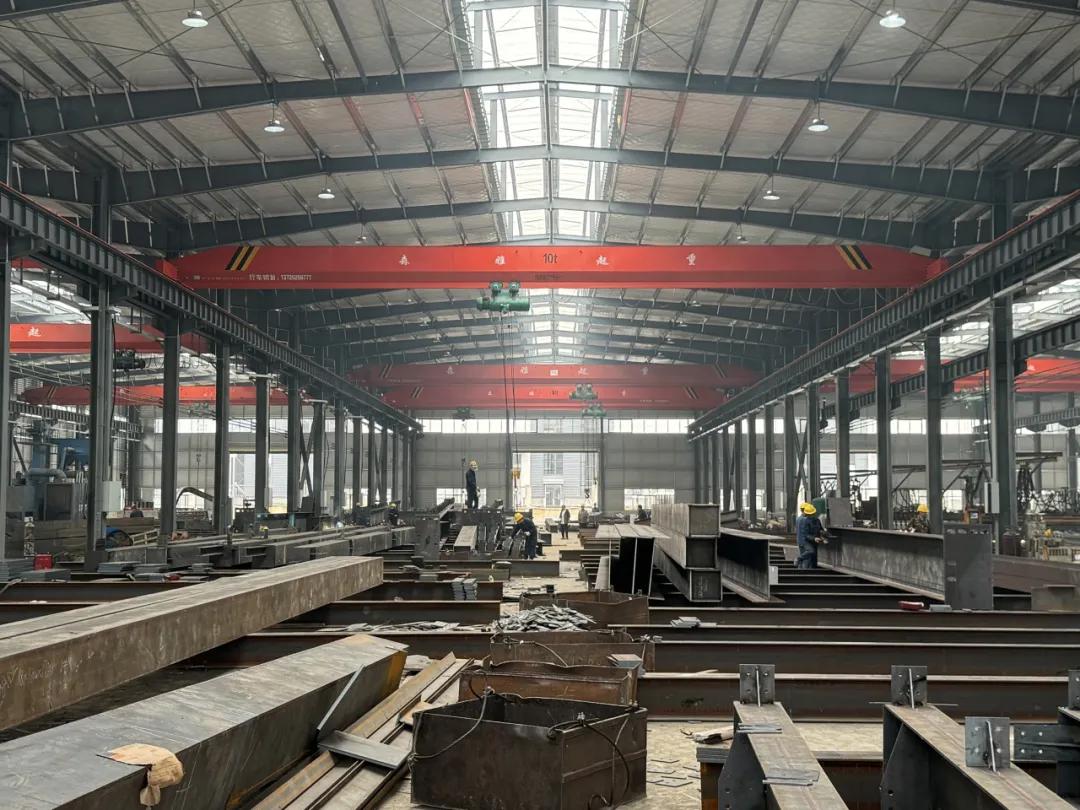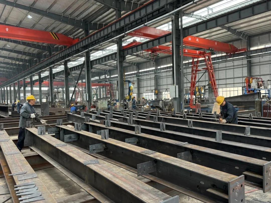 走进生产车间,一派热火朝天的实干景象扑面而来:巨型行车稳稳吊运着H型钢梁缓缓移动,低沉的机械轰鸣贯穿全场;工人们手持焊枪专注开展加固作业,飞溅的焊花如星雨洒落,勾勒出忙碌的生产图景;流水线上,钢构件依次经过矫直、组立、焊接、打磨等多道精密工序,在机械自动化与人工精细化的协同配合下逐步成型。厂房内,机器运转声与金属碰撞声交织回荡,独特的工业气息中,处处彰显着项目投产后的蓬勃活力。