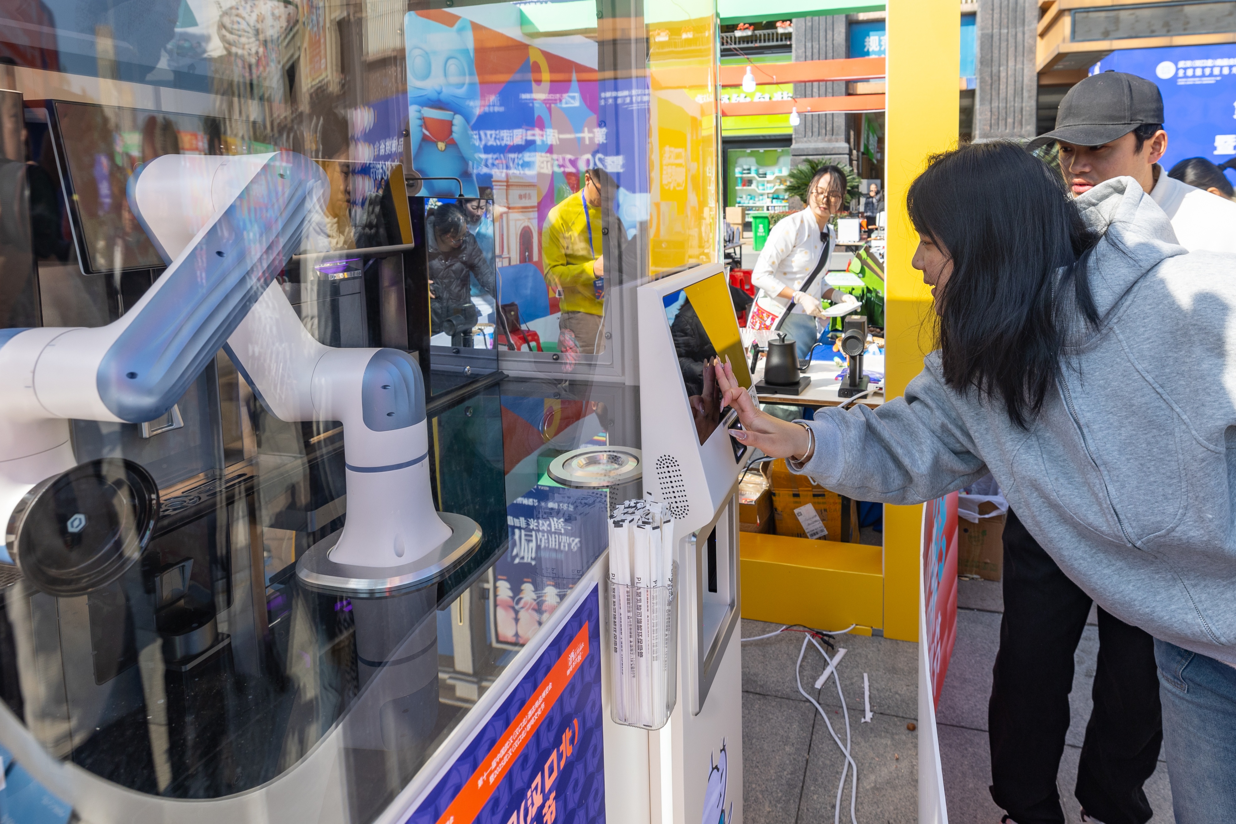 各展区AI应用亮点纷呈,药食同源展区引入AI体质检测,国际花卉展启用AI数字人直播,咖啡茶饮区上演人机拉花竞技。湖北汉口茶厂推出AI泡茶机,可自动识别茶叶品类并精准调控水温和冲泡时间。肴滚智慧大厨的炒菜机内嵌云菜谱平台,拥有2.4万余道菜谱,从加油、倒蛋液到出锅全程自动化,126秒即可完成一份“港式滑蛋”。