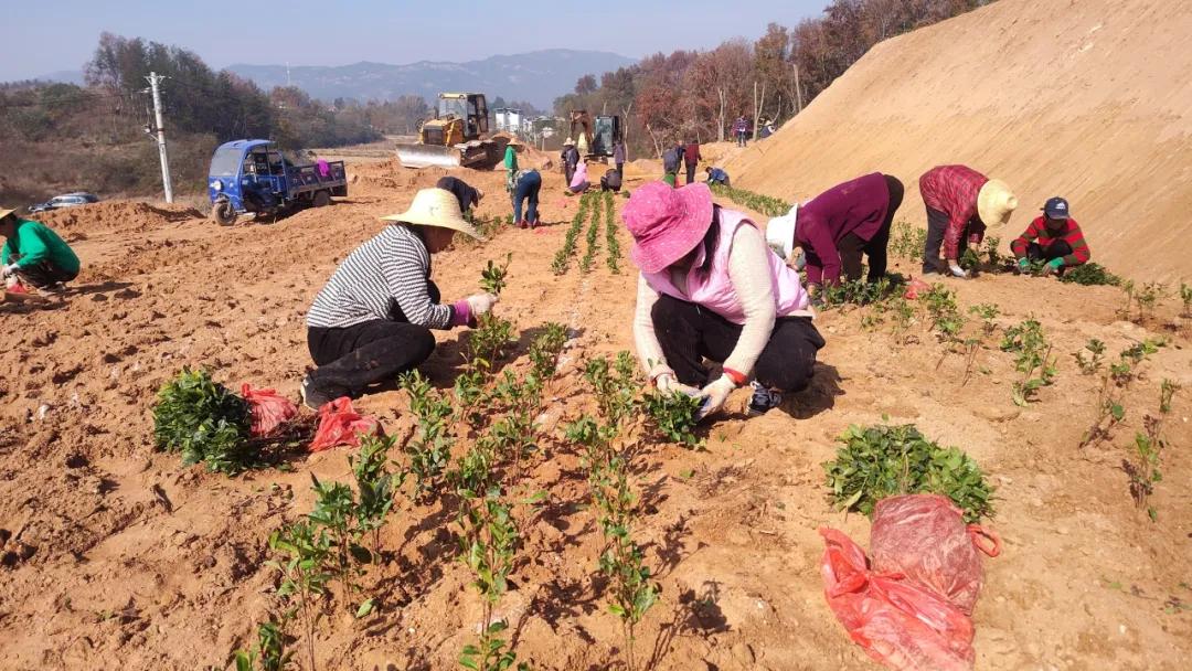 姚家集街的茶叶更新改造基地,嫩绿的茶苗整齐排列,种植户们抢抓晴好天气忙着定植茶苗、搭建喷滴灌设施,田间地头一派生机勃勃的劳作景象。
