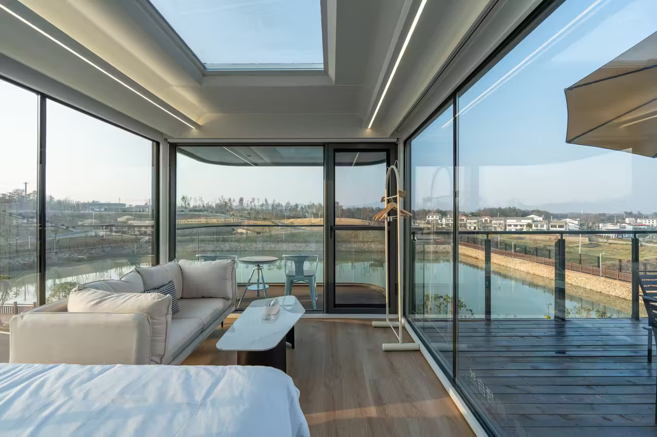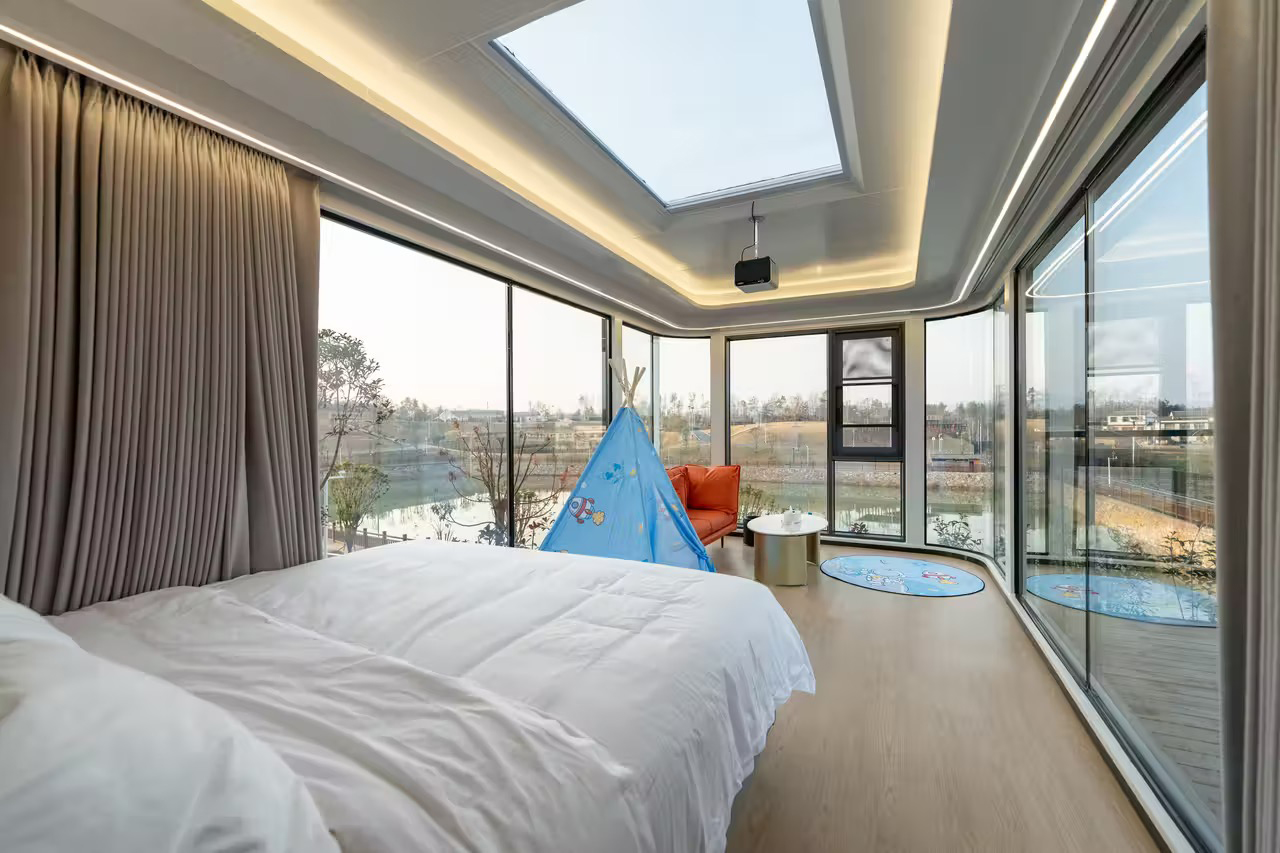 重点是舱内配置——全智能控制系统,躺着就能操控灯光、窗帘;270°全景落地窗,早上被阳光叫醒,晚上枕着星空入眠;还有专属观景阳台,喝茶聊天看风景,氛围感直接拉满!