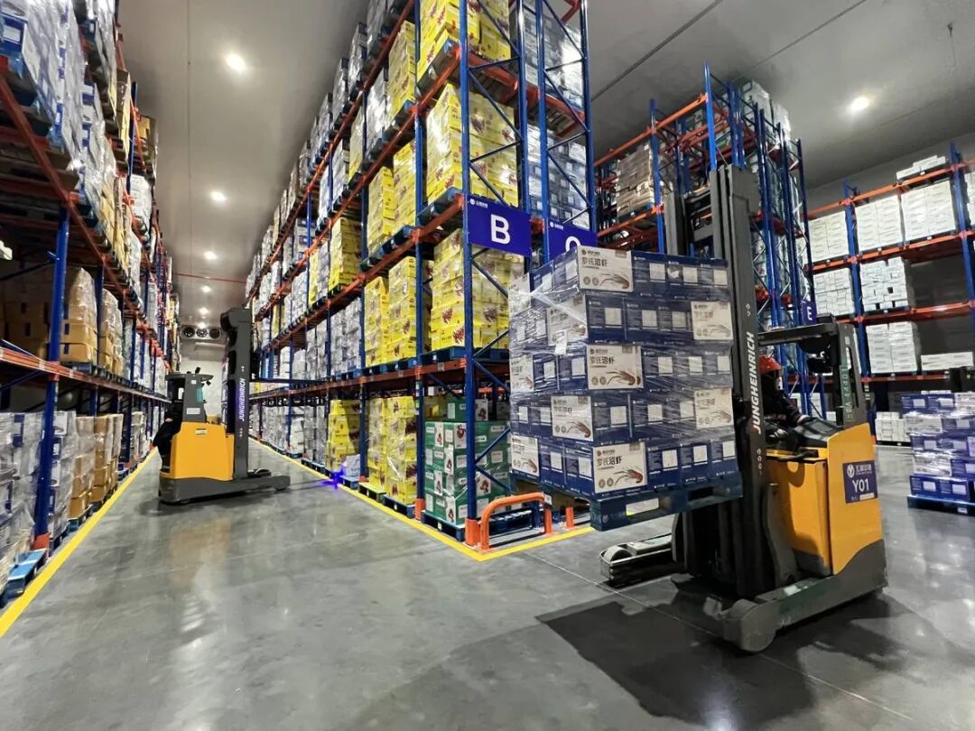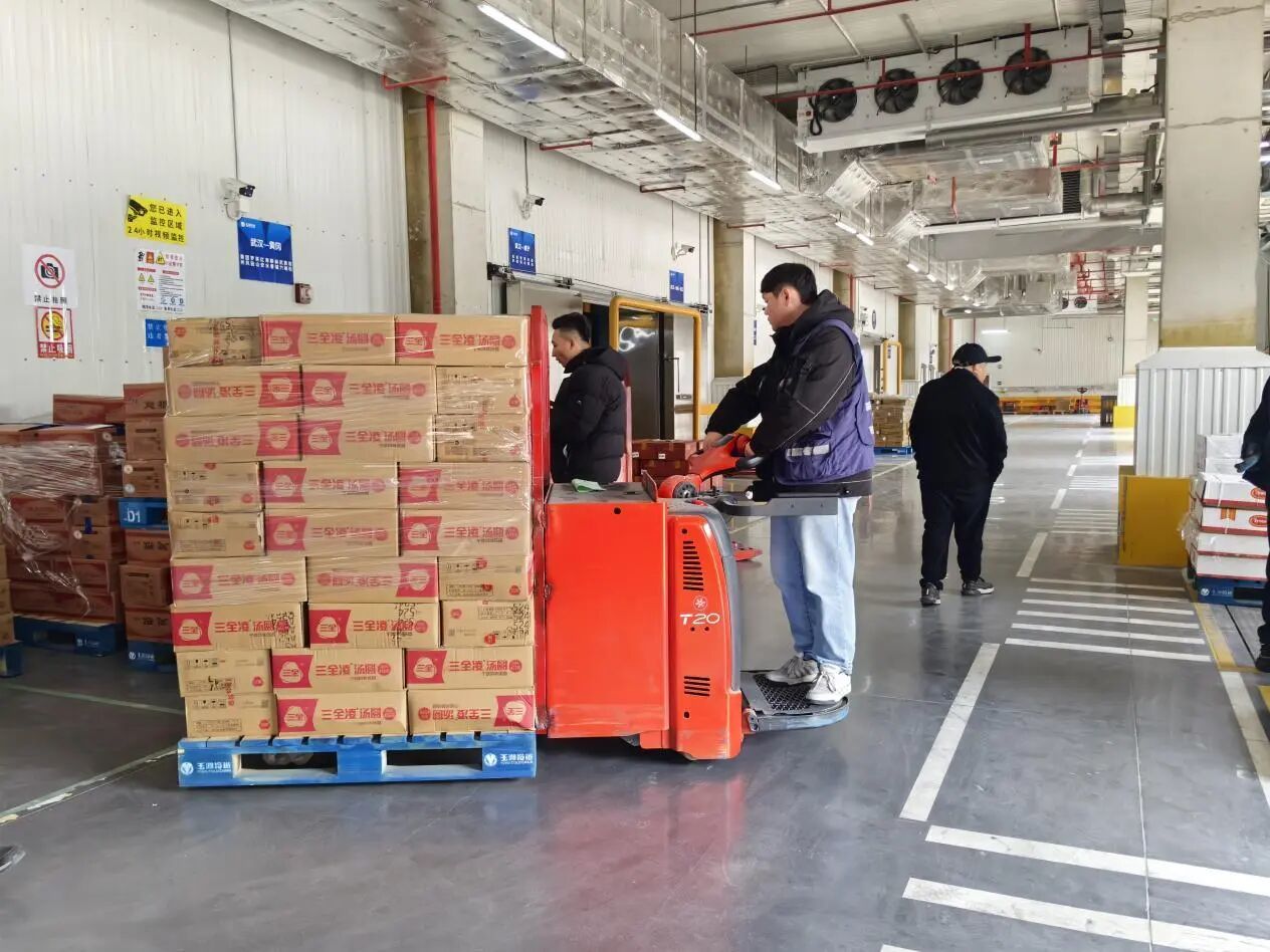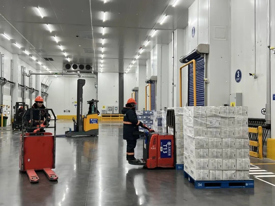 库房内,零下十几度的低温环境挡不住火热的作业节奏,工人操作着叉车来往穿梭,分拣、入库、出库一气呵成。