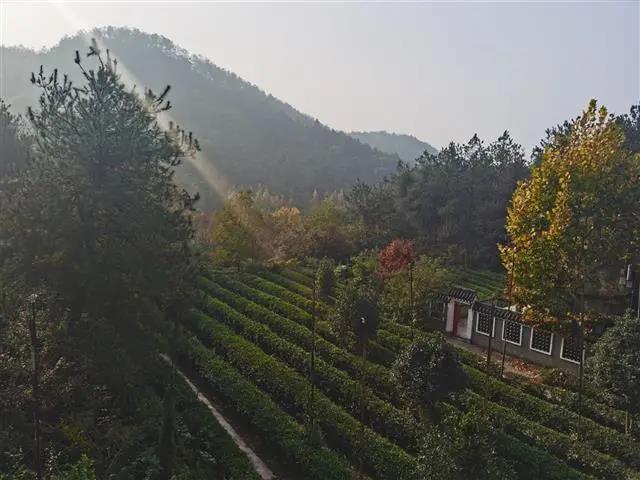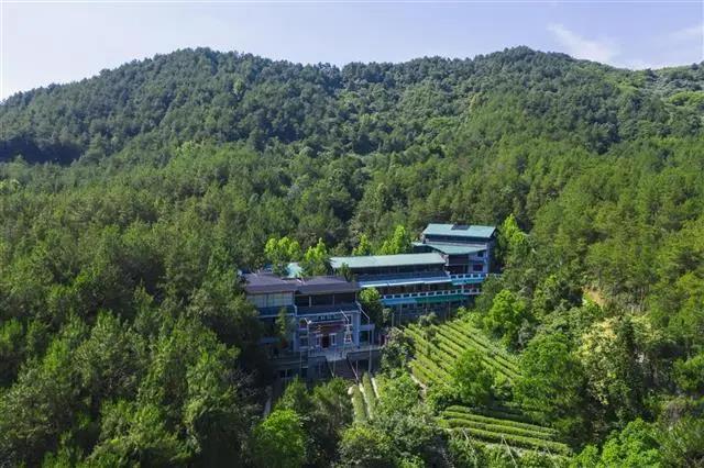 树在房屋和天井中生长,水在屋檐和洞底下流淌,茶室连着茶园,茅亭映在水中。一栋栋白墙灰瓦的传统建筑,在大片绿色的掩映中,显得静谧、从容。