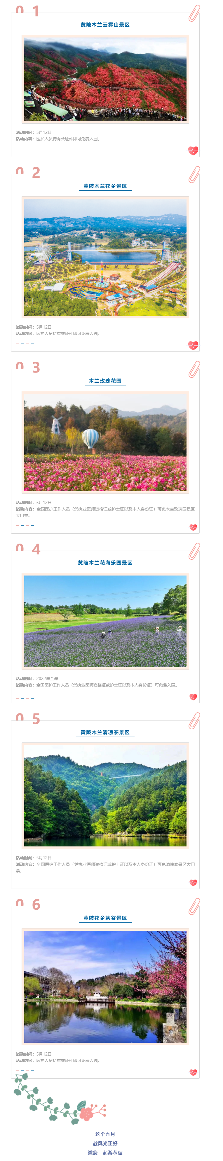 五月,是花开的季节,更是感恩的季节。在第111个5.12国际护士节来临之际,黄陂多家景区向医护工作者推出优惠活动,表达崇高的敬意和节日的问候。医护人员凭有效相关证件,即可享受免门票等优惠。