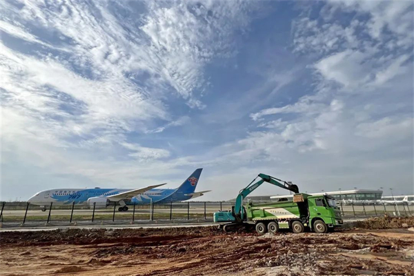 连日来,武汉天河国际机场东侧第二跑道旁,挖掘机铁臂挥舞、混凝土泵车轰鸣作响。