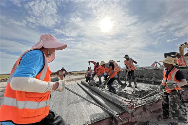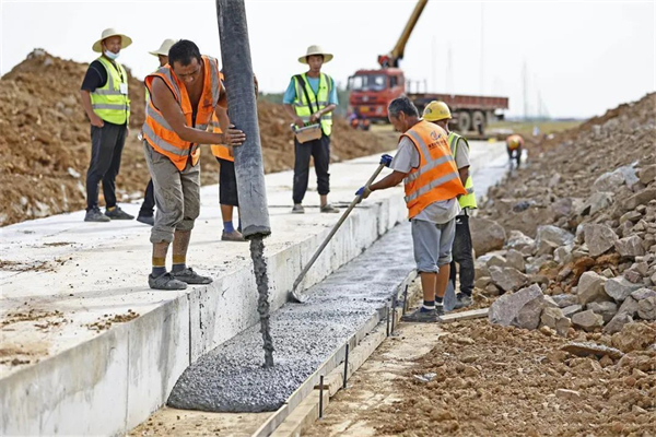 “昼夜不停施工,人员两班倒,歇人不歇机。”李磊说,8条联络道共需浇筑超过5万立方米干硬性混凝土。为确保建设进度,项目部在现场建有大型混凝土搅拌站,并囤积大量砂石、水泥等物料,确保供应不断档。