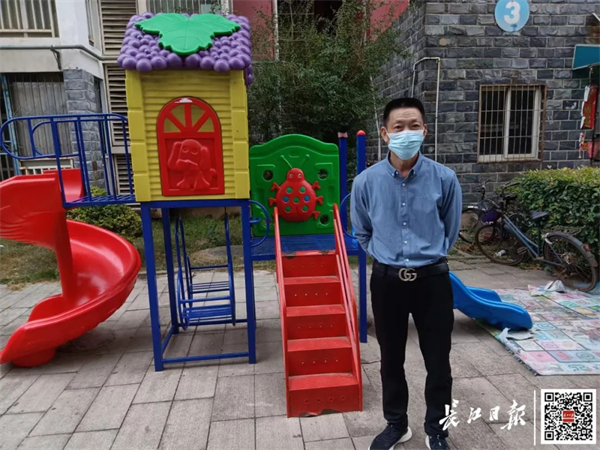 业主刘星站在其购置的儿童滑滑梯旁。记者李爱华 摄