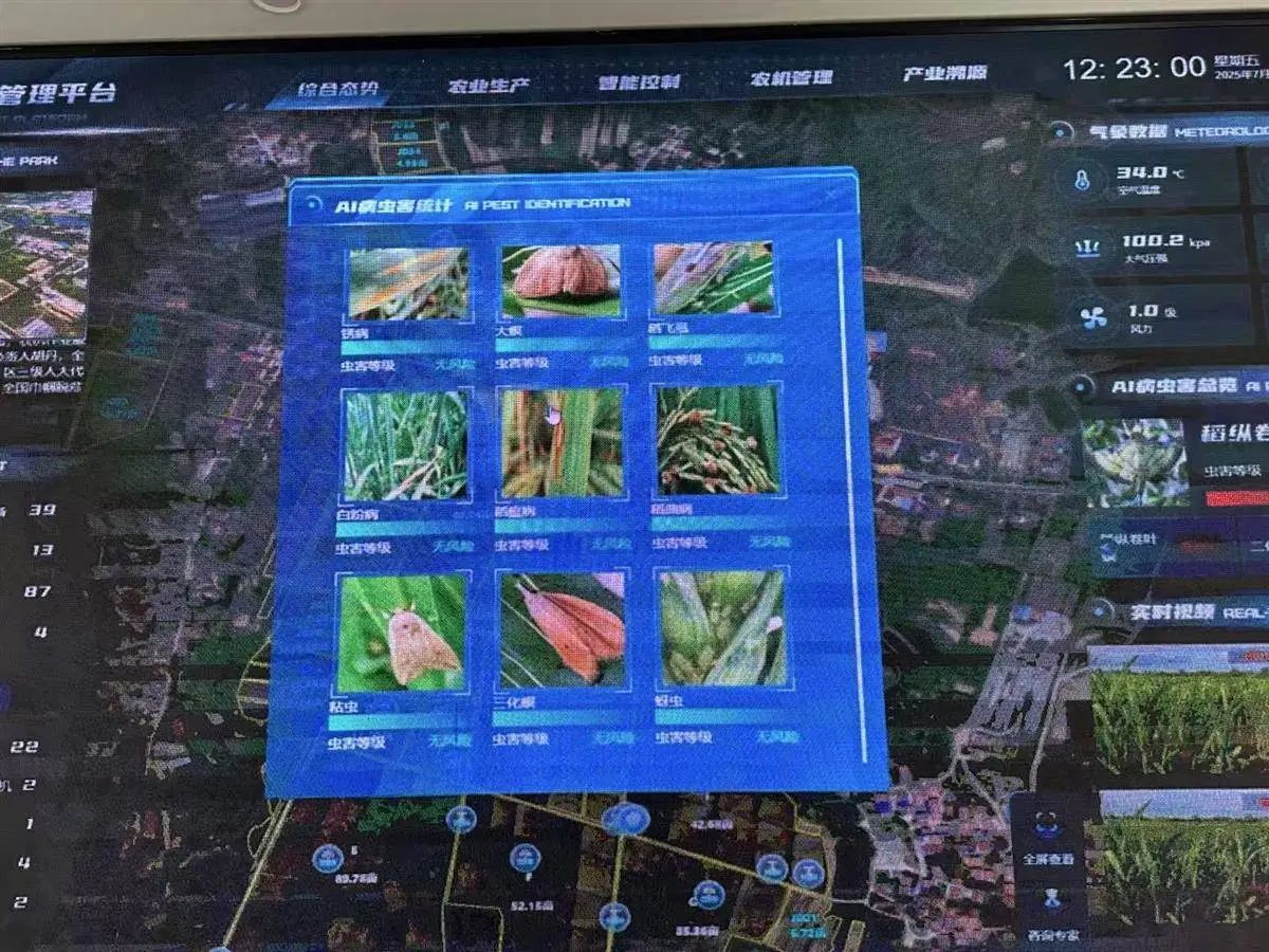 置身田间,每隔10亩地就伫立着一盏太阳能灭虫灯。农场控制室的智慧大屏上,害虫种类、病虫害风险预警等信息一览无余。