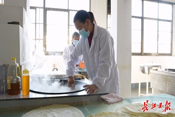 走进体验馆,工作人员正将混合黄豆、大米磨成的米浆浇在铁锅里,只见手腕轻转,瞬间便摊成一张柔韧薄皮,裹上腌菜即可食用。朝阳村妇女委员艾文静介绍:“游客来了不仅能尝鲜,还能亲手体验制作过程。”