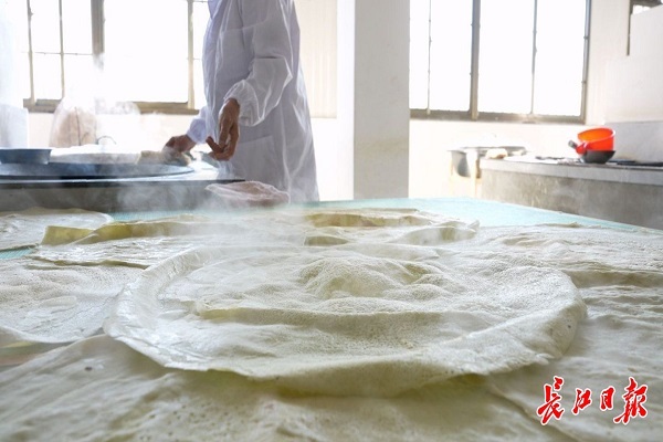 从武汉市区专程赶来的王先生购买了60元新鲜煎制的豆丝,“带回家卷上香肠,就是一道地道农家风味”。