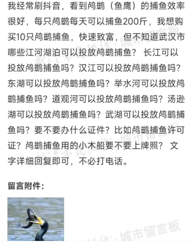 “听说一只鸬鹚每天可以捕鱼200斤,我想购买10只鸬鹚捕鱼,快速致富。”近日,有市民在城市留言板抛出其设想的“致富经”,并询问长江、汉江、东湖、举水河、汤逊湖等水域是否可以投放鸬鹚捕鱼。