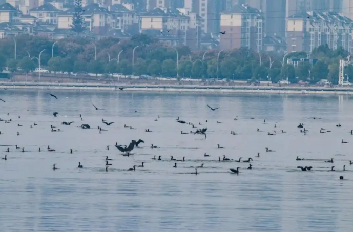 据九派新闻此前报道,有市民曾记录500余只普通鸬鹚在武汉南湖集体捕鱼的场景,它们形成队形捕鱼,捕一会儿就移动到另一个区域,整个过程持续约半个小时。等吃饱以后,它们又成群结队地飞走。