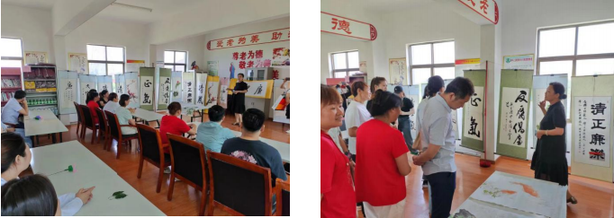 在清廉村居书画展现场,李老师为大家展示了三十余幅清廉主题的书画,借助书画艺术将“廉”的精神在农村干部和村民中广泛宣扬。李老师结合六家砦村广泛种植的“莲花”,从“莲之品性”着手,既讲莲之清净、守静、正直、有节之雅义,又讲绘画用笔、运笔之技巧,还讲书画家创作的背景历史,积极引导群众了解廉政故事、家风古训等廉洁文化,引导党员干部和村民自觉接受廉洁文化洗礼,不断增强拒腐防变的能力。