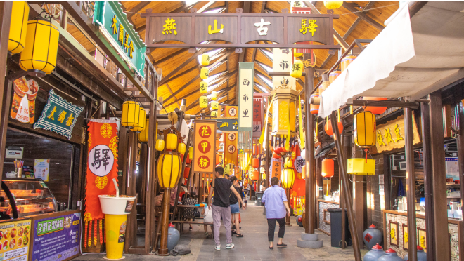 入夜伊始,木兰不夜城内彩灯万盏,火树银花。霓虹舞曲穿越北魏,再现《木兰辞》中的市井繁华。15大主题舞台30场艺术演绎,融入长街古巷,游客穿梭其中,流连忘返。