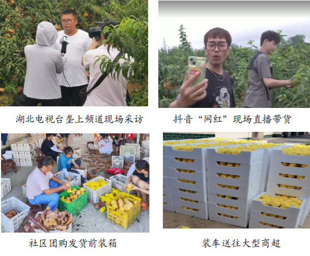 在黄桃成熟前,驻村工作队就与村党支部、合作社共同探讨今年黄桃产量情况,提前谋划布局销路。在7月20日黄桃园开园当天,驻村工作队通过市农业农村局邀请湖北垄上频道进行宣传报道,并邀请大型社区团购企业、网络主播、爱心企业等来村助阵,并现场敲定合作事宜,成功帮销近万斤黄桃。在驻村工作队的协调下,六家砦村黄桃还成功登上中百仓储、中百超市和徐东平价等大型商超的货架,最多的时候一天能销售1万斤,平均每日销售6000斤。