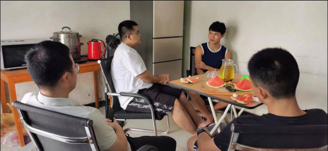 今天,向正启利用暑假兼职做教练的短暂休息时间,回村探望大伯大妈,如约到工作队驻地向我们汇报学习和生活近况。就像自家亲人远道归来,工作队同志们都放下手头的工作,端上香甜可口的冰镇西瓜,泡上清凉解渴的大麦茶,围坐在桌前,话匣子打开,仿佛有说不完的话题。