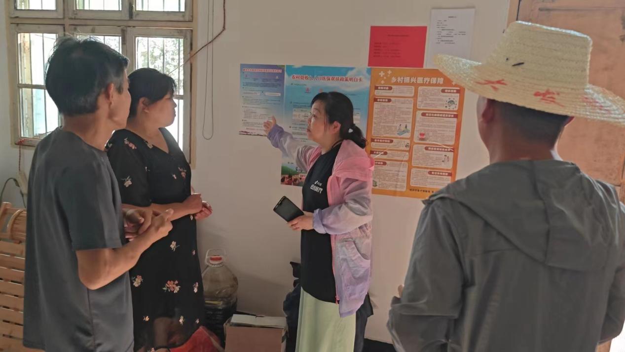 2023年8月10日,铁江湾村驻村工作队人员与村“两委”干部一起入户宣传最新医疗保险和救助政策,进一步提高脱贫户对医保帮扶政策的知晓度,真正将医保惠民政策落到实处,巩固脱贫攻坚工作成果,确保不因病返贫、因病致贫。