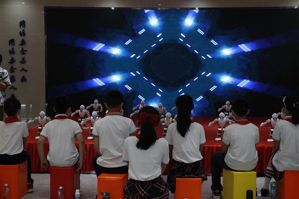 图:黄陂区实验小学的同学们观赏“阿尔法机器人”互动表演