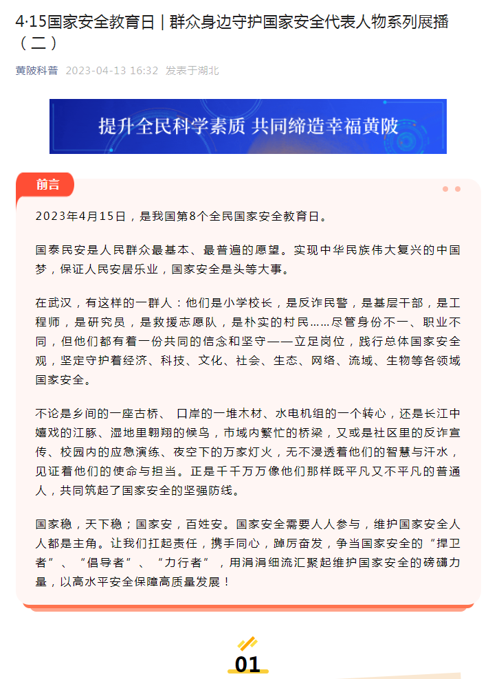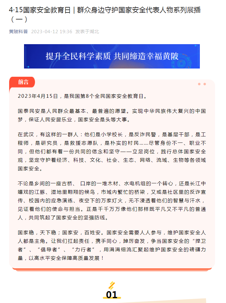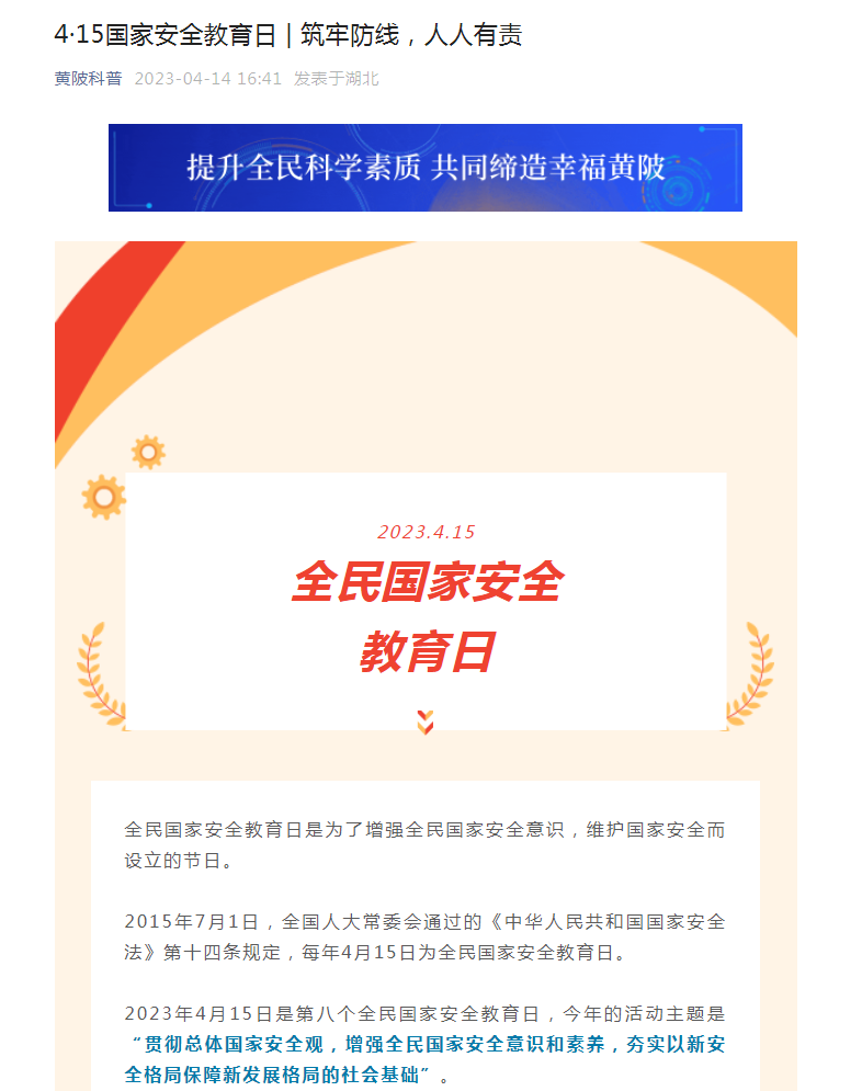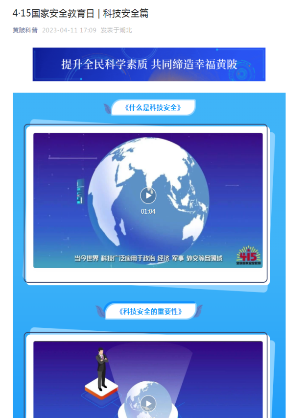 4月10日至4月17日期间,区科协还充分利用全媒体科普视窗、“黄陂科普”微信公众号等载体,播放国家安全宣传海报、视频、标语等内容,着力增强全民国家安全意识,推动大安全理念深入人心。