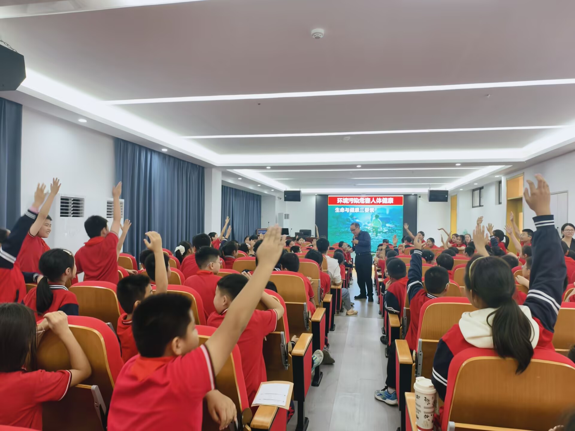 活动中,徐世球教授以生动鲜活的语言、形象贴切的比喻,将复杂的科学知识转化为学生易于理解的内容,深入浅出地讲解了环境污染的类型、危害及防护要点。从“呼吸系统如何过滤有害物质”到“人体巨噬细胞的防御机制”,他用生活化的科学解读,让同学们清晰认识到环境保护与自身健康的紧密关联。现场互动环节氛围热烈,同学们积极举手提问、踊跃参与趣味游戏,在轻松愉快的氛围中将“保护环境就是保护自己”的理念深深扎根心中。