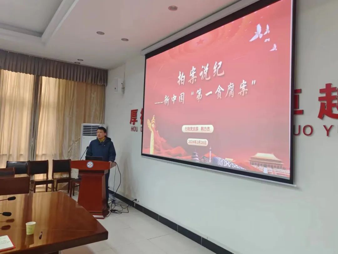 “为什么毛主席会亲自下令处决二人呢……”在行政党支部2月主题党日中,纪检委员做“拍案说纪”宣讲。党员们跟随主讲人一起重温新中国“贪腐第一案”,学习《中国共产党纪律处分条例》。大家听得聚精会神,引起热烈反响和强烈共鸣。