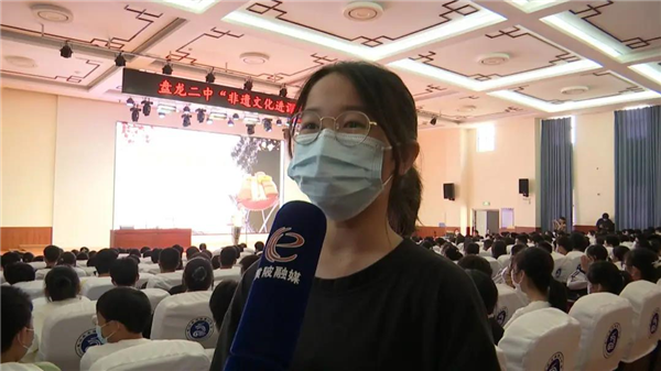 盘龙二中八年级学生宁颜颜:“刚刚吴健老师给我们介绍了很多国家级、省级的非物质文化遗产,吴健老师的表演非常精彩,让我感受到了非物质文化遗产的魅力,以后我也会和我的同学一起积极传承和发扬非物质文化遗产这些珍贵的历史文化。”